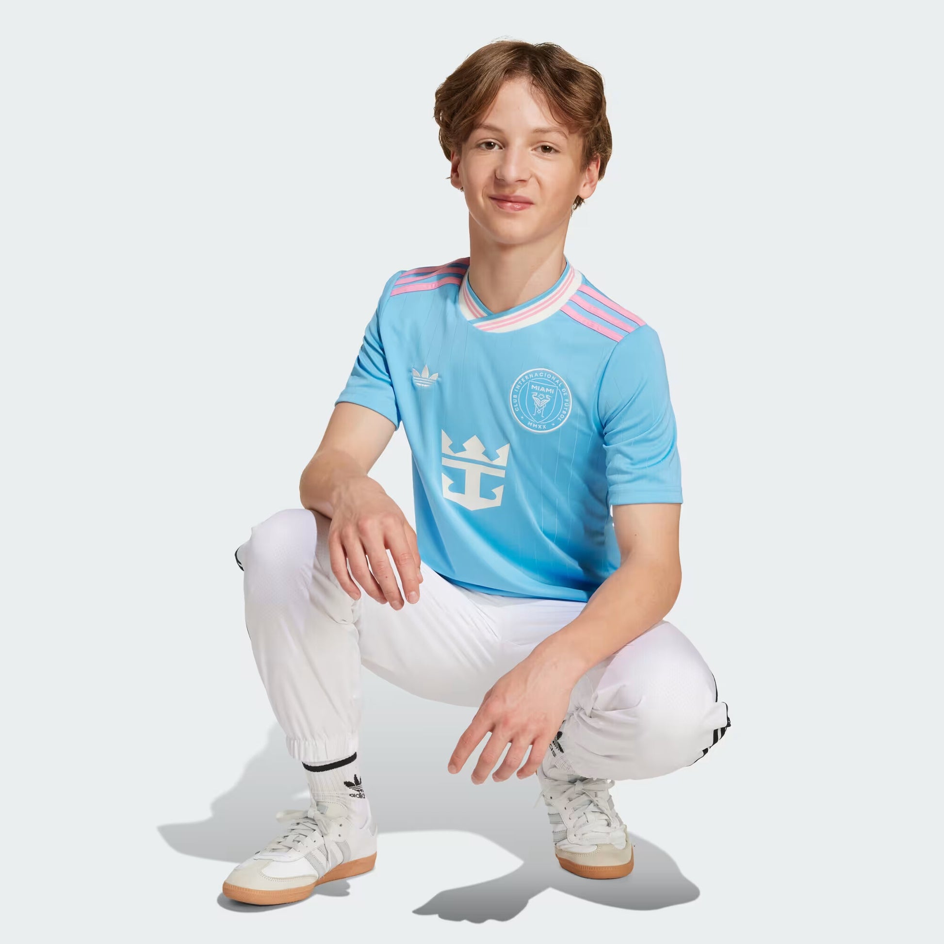 The vibrant spirit of Miami and the beauty of its world-famous coastline meet in this juniors' Inter Miami CF jersey. Broken only by waves of subtle pinstripes and pops of pink, the ocean-blue colors of this third shirt bring a calming elegance. Sewn onto the soft fabric, a club badge and adidas Trefoil add extra appeal. Moisture-managing AEROREADY ensures it feels pretty special too.